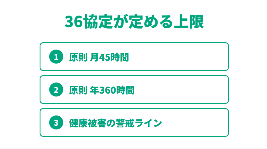 厚生労働省の定める限度基準では、この36協定では原則として月45時間・年360時間が上限です。臨時的な特別の事情がある場合には特別条項により例外が認められることがありますが、その場合も法定上限があります。