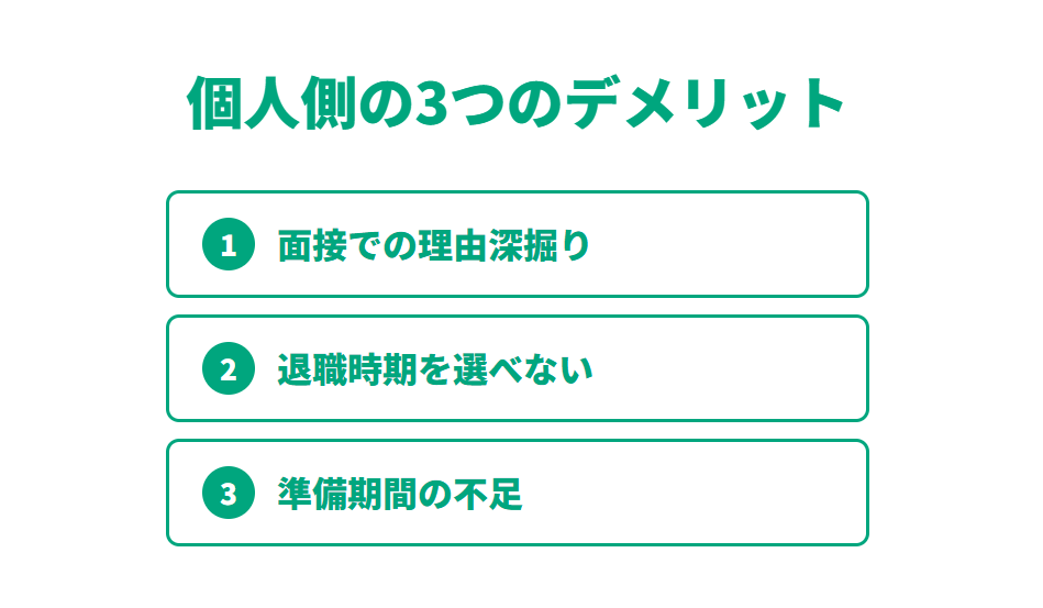 退職後の生活や転職活動に影響しうる3つのデメリットを、あらかじめ把握しておくことが大切です。
